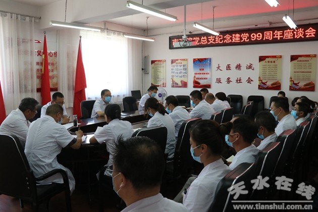 座談會上,全體黨員重溫了入黨誓詞。市五院黨總支委員、第一黨支部副書記郭萬玉同志宣讀《中共天水市第五人民醫(yī)院總支部委員會關(guān)于表彰優(yōu)秀共產(chǎn)黨員的決定》,與會領(lǐng)導(dǎo)現(xiàn)場向3名優(yōu)秀共產(chǎn)黨員代表頒發(fā)榮譽(yù)證書。隨后市五院黨總支紀(jì)檢委員、副院長縣錦春同志領(lǐng)學(xué)《中國共產(chǎn)黨簡史》,回顧了中國共產(chǎn)黨99年的光輝歷史。3位黨員代表結(jié)合工作實際作了交流發(fā)言。