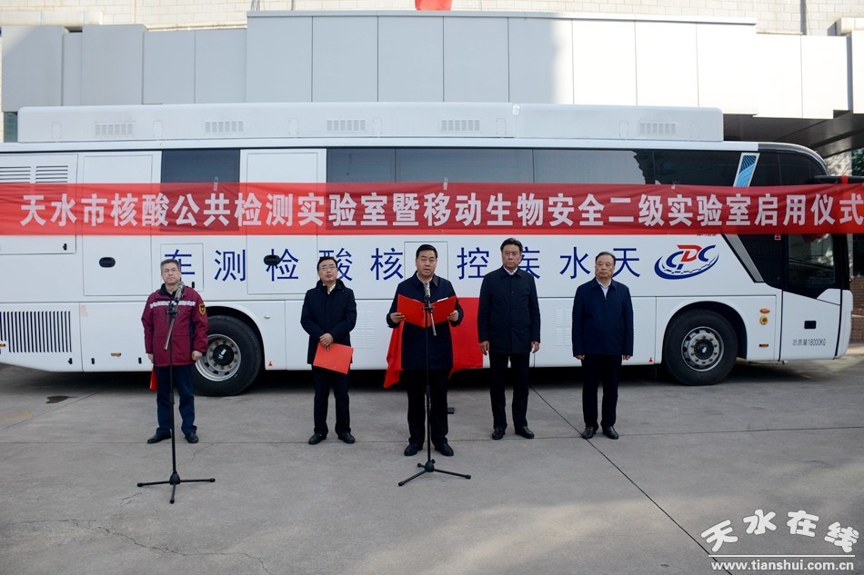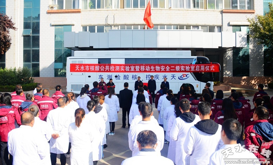 2021年10月16日上午,天水市首輛移動核酸檢測車(移動生物安全二級實驗室)揭牌啟用儀式在市疾控中心舉行。市政府黨組成員逯克宗,市政府副秘書長邵宏偉,市衛(wèi)健委黨組書記、主任、二級巡視員陳克孝,天水市第五人民醫(yī)院領(lǐng)導(dǎo)班子成員及檢驗科全體工作人員和部分職工代表、天水市疾控中心負(fù)責(zé)同志及職工代表參加揭牌啟用儀式。啟用儀式由市政府副秘書長邵宏偉主持,市政府黨組成員逯克宗致辭。