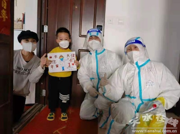 11月5日,我們的任務(wù)是運(yùn)送核酸樣本。那天的氣溫出奇的冷,有一組隊(duì)員去的是麥積區(qū)麥積鎮(zhèn)賈河,行至途中,車子突然一百八十度大轉(zhuǎn)彎,路面因?yàn)榻Y(jié)冰濕滑不能前進(jìn)了,這可咋辦?幾萬人的核酸樣本肯定要送過去,我們焦急地想著辦法。醫(yī)師王寶福和司機(jī)張建建率先用手扳地上的土塊摔到車輪下增加摩擦力,大家紛紛效仿,齊心協(xié)力之下車才慢慢地到達(dá)了目的地。拖著疲憊身體收工時(shí),我們竟收到了一份意外的禮物和驚喜,麥積區(qū)麥積鎮(zhèn)一位村民給我們送來了兩幅字畫“白衣天使”,是啊,白衣執(zhí)甲,無畏逆行!當(dāng)天轉(zhuǎn)戰(zhàn)天慶國際封控區(qū)的16號(hào)樓入戶采核酸,5樓住戶一遍又一遍說著感謝的話,4歲的孩子送來自己創(chuàng)作的手抄報(bào),還給我們表演了歌舞《童心向黨》。我們的眼眶再次濕潤(rùn)了,麥積,抗疫我們?cè)谝黄稹?/P>