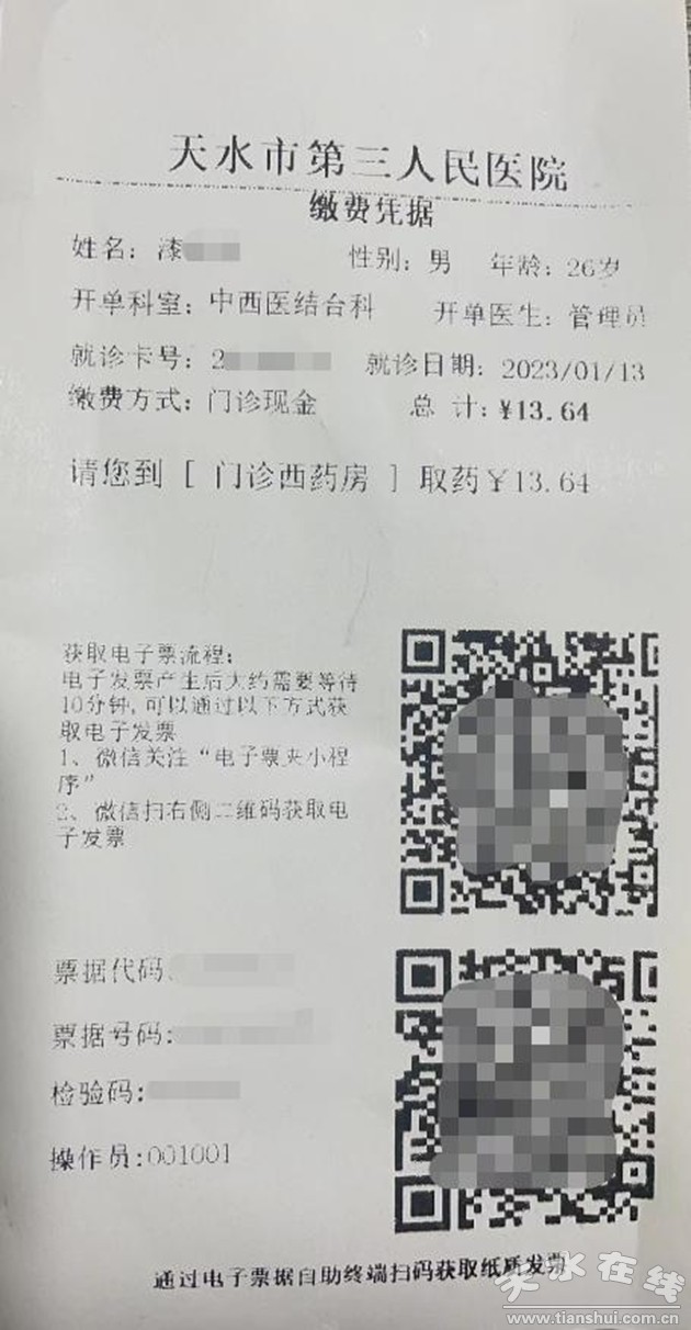 患者在門診、住院繳費結(jié)算后,窗口收費人員會打印“天水市第三人民醫(yī)院電子發(fā)票憑證”(如下圖)給患者,患者可通過個人微信掃碼、關(guān)注“天水市第三人民醫(yī)院公眾號”獲取、電子票據(jù)自助打印機掃碼等多種方式獲取、打印電子發(fā)票。