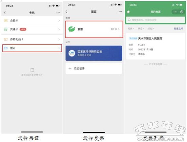 關(guān)注“天水市第三人民醫(yī)院公眾號”,選擇【個人中心】—【電子發(fā)票】,進入電子發(fā)票界面后,選擇我的票夾,可查看所有個人發(fā)票,選中需要查看下載的發(fā)票,可預(yù)覽發(fā)票或?qū)l(fā)票保存至微信進行查看及下載打印。