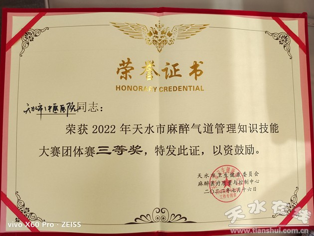 ——天水市中醫(yī)醫(yī)院手術(shù)麻醉科醫(yī)師團隊榮獲天水市首屆麻醉氣道管理知識技能大賽團體三等獎