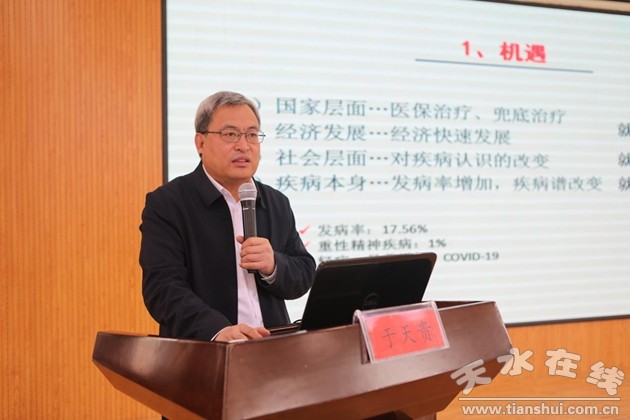 簽約儀式結束后,山東省精神衛(wèi)生中心黨委書記于天貴作了題為《精神?漆t(yī)院未來發(fā)展的若干思考》的學術報告。在醫(yī)院發(fā)展、業(yè)務提升、人才隊伍培育和科研教學等方面分享了寶貴經驗。