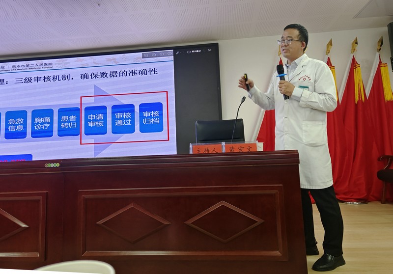 市二院專(zhuān)家分別就胸痛救治單元建設(shè)組織管理、綠色通道、胸痛規(guī)范診治及數(shù)據(jù)庫(kù)管理等內(nèi)容給予詳細(xì)指導(dǎo),并深入科室就標(biāo)識(shí)標(biāo)牌設(shè)置、時(shí)鐘統(tǒng)一管理、設(shè)備操作流程、救治流程等內(nèi)容對(duì)醫(yī)護(hù)人員進(jìn)行現(xiàn)場(chǎng)指導(dǎo),對(duì)創(chuàng)建中存在的問(wèn)題提出建議。隨后,裴宏文、牛全洲張助之、 陳玥分別從《區(qū)域協(xié)同救治體系》《胸痛救治單元建設(shè)內(nèi)容與流程》《急性胸痛快速轉(zhuǎn)診機(jī)制》《冠心病健康教育》《腦卒中的識(shí)別》《猝死與心肺復(fù)蘇》《高危急性胸痛及ACS早期癥狀識(shí)別》《急性心肌梗死及常見(jiàn)心律失常的心電圖診斷》《心電工作站的技術(shù)操作》等九個(gè)方面作了詳細(xì)講解。講座后,急診科護(hù)師雷想魁、心內(nèi)二病區(qū)護(hù)師杜倩蓉為參會(huì)人員進(jìn)行了心肺復(fù)蘇的實(shí)操培訓(xùn)。