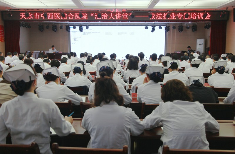 為進(jìn)一步加強(qiáng)醫(yī)院醫(yī)療質(zhì)量管理,增強(qiáng)醫(yī)務(wù)人員法律意識和職業(yè)素養(yǎng),提高醫(yī)務(wù)人員依法執(zhí)業(yè)水平,結(jié)合“三抓三促”行動“抓學(xué)習(xí)促提升”各項要求,6月2日下午,天水市中西醫(yī)結(jié)合醫(yī)院(市二院)特邀甘肅羲秦律師事務(wù)所執(zhí)業(yè)律師、主任李建濤和天水市司法鑒定行業(yè)協(xié)會黨委副書記、會長靳忠來院開展“法治大講堂”——依法執(zhí)業(yè)專題培訓(xùn)。市二院在家班子成員、全院中層干部和醫(yī)療醫(yī)技科室質(zhì)控員參加培訓(xùn)。培訓(xùn)會由黨委委員、副院長姚雄兵主持。