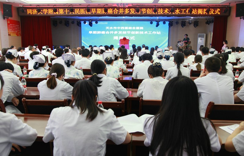 7月7日,在天水市中西醫(yī)結(jié)合醫(yī)院(市二院)舉行“早期肺癌合并多發(fā)結(jié)節(jié)創(chuàng)新技術(shù)天水工作站”揭牌儀式。同濟(jì)大學(xué)附屬第十人民醫(yī)院黨委書記范理宏、黨辦主任溫靜、醫(yī)療資源發(fā)展處常務(wù)副處長費鴻翔、中西醫(yī)整合醫(yī)學(xué)科副主任李明和天水市政府副市長汪小娟、市衛(wèi)健委主任王定新、市科技局副局長吳曉棠及市二院班子成員、各科主任以及業(yè)務(wù)骨干參加揭牌儀式。揭牌儀式由院長唐志鋒主持。