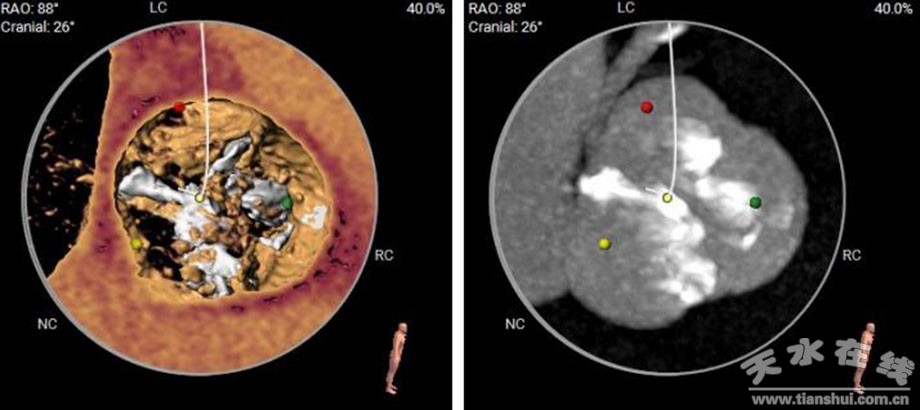 開(kāi)展TAVR手術(shù),精細(xì)的術(shù)前評(píng)估及MDT會(huì)診是至關(guān)重要的。在醫(yī)務(wù)科的大力協(xié)助下,洪志斌院長(zhǎng)組織心內(nèi)科、心外科、超聲科、麻醉科以及導(dǎo)管室和護(hù)理團(tuán)隊(duì),對(duì)王奶奶的病情及解剖結(jié)構(gòu)做了深入分析。心臟增強(qiáng)CT顯示,王奶奶的主動(dòng)脈瓣為Type1型的二葉瓣,左冠竇和右冠竇有非常嚴(yán)重的粘連,且各竇均有嚴(yán)重的鈣化,導(dǎo)致主動(dòng)脈瓣開(kāi)啟困難且閉合不佳。對(duì)主動(dòng)脈全程做分析,血管迂曲不嚴(yán)重,內(nèi)徑大小合適,冠脈開(kāi)口較高,整體解剖結(jié)構(gòu)非常適合TAVR手術(shù)。遂決定,盡快為王奶奶完成TAVR手術(shù),并邀請(qǐng)?zhí)m州大學(xué)第一醫(yī)院白明院長(zhǎng)及徐吉喆教授團(tuán)隊(duì)現(xiàn)場(chǎng)指導(dǎo)。