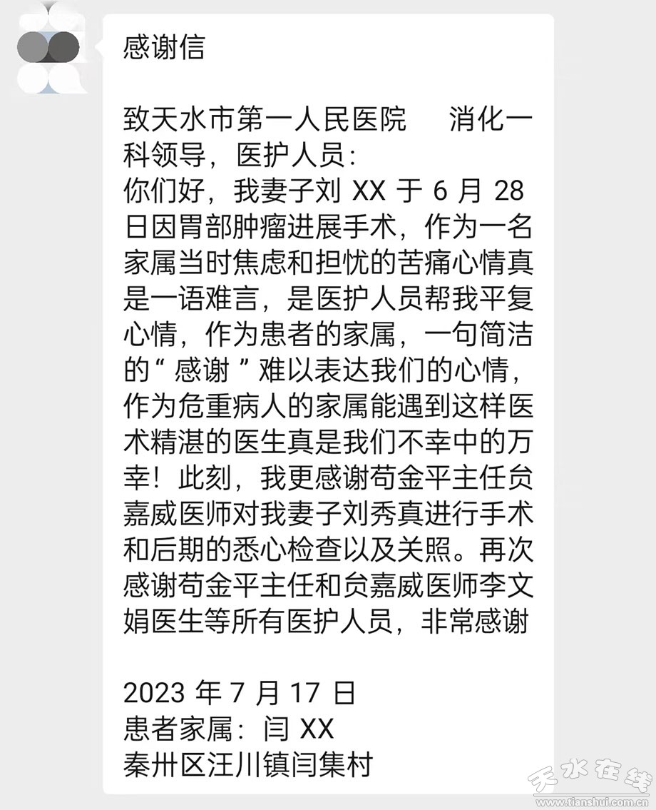 出院后,劉女士攜丈夫?qū)懴赂兄x信,寄送天水市第一人民醫(yī)院。