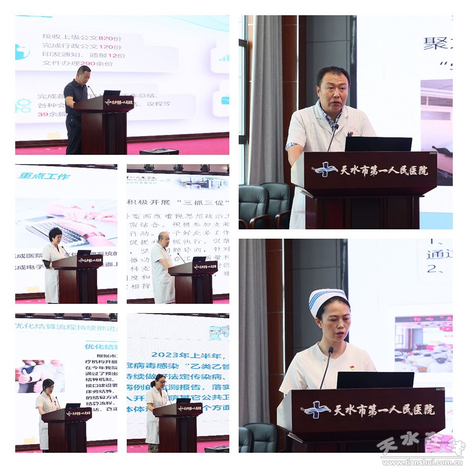 會(huì)上,全院行政職能科室主任依次通過PPT形式,結(jié)合2023年度科室目標(biāo)管理責(zé)任書,聚焦各自負(fù)責(zé)的領(lǐng)域,圍繞優(yōu)質(zhì)服務(wù)、工作實(shí)績、學(xué)科建設(shè)、人才培養(yǎng)、智慧醫(yī)院、安全生產(chǎn)等方面對(duì)上半年工作進(jìn)行全面總結(jié),展示成績亮點(diǎn),分析存在不足,制定對(duì)策措施,并對(duì)下半年工作進(jìn)行科學(xué)謀劃。各分管領(lǐng)導(dǎo)在聽取匯報(bào)的基礎(chǔ)上,對(duì)各部門科室上半年工作開展情況進(jìn)行了點(diǎn)評(píng),強(qiáng)調(diào)職能科室要從抓薄弱環(huán)節(jié)入手,充分發(fā)揮安排部署、檢查督導(dǎo)、服務(wù)協(xié)調(diào)等作用,動(dòng)腦筋、想出路,謀發(fā)展、創(chuàng)佳績,推動(dòng)醫(yī)院各項(xiàng)工作扎實(shí)開展。