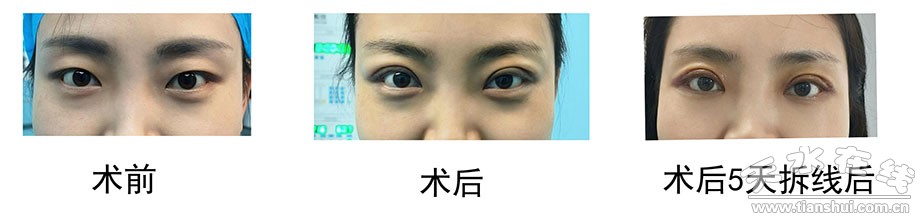 在手術(shù)前,幫扶隊吳蘇榮副主任根據(jù)患者的眼睛條件和求美者的要求進(jìn)行了個體化設(shè)計,充分考慮了重瞼線的走形和弧度、重瞼寬度、眶隔脂肪的量以及眼間距等因素,并征得患者的同意后簽署了手術(shù)相關(guān)協(xié)議。在手術(shù)中,吳蘇榮醫(yī)生采用了平扇形切開法重瞼,并根據(jù)實際情況取皮、取脂。手術(shù)進(jìn)行順利,術(shù)后求美者非常滿意。術(shù)后5天拆線,10天后腫脹已經(jīng)逐漸消退。