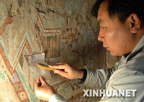 11月16日,敦煌研究院的工作人員在敦煌莫高窟用木刀回帖起甲的壁畫。 新華社記者 王艷明