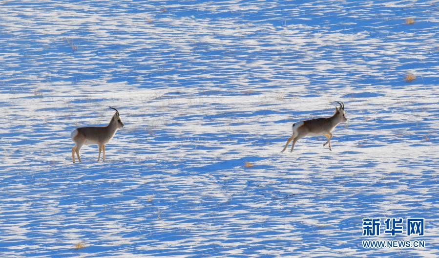 12月23日,兩只國家二級保護(hù)動(dòng)物藏原羚在哈爾騰草原上覓食。