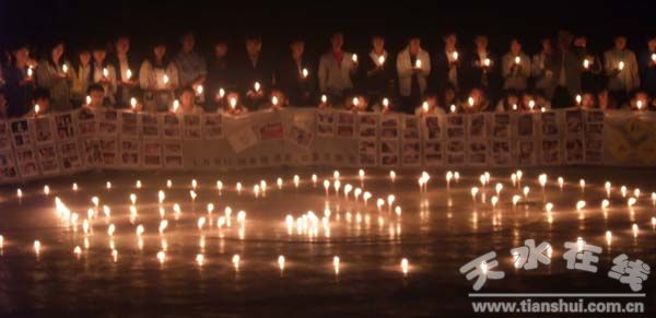 5月12日當(dāng)天 晚上8點(diǎn),由信息系、化工系承辦的主題為“愛心祈福,天佑中華,汶川加油!中國加油!”紀(jì)念5.12燭光祈福晚會(huì)在學(xué)院籃球場隆重舉行。同學(xué)們手持蠟燭,擺成了一顆“祈福的心”在“心”中央映出了5.12的字樣;顒(dòng)在進(jìn)行,而手持蠟燭來祈福的人越來越多,整個(gè)籃球場都擠滿了,籃球場上失去了往日的歡歌笑語,取而代之的是沉靜、哀思!最后大家高呼“中國加油!四川加油!汶川加油!!”全院師生用這種特殊的方式,特殊的行動(dòng),去紀(jì)念,去懷念在大地震中罹難的同胞,活動(dòng)持續(xù)到晚11點(diǎn)才結(jié)束。