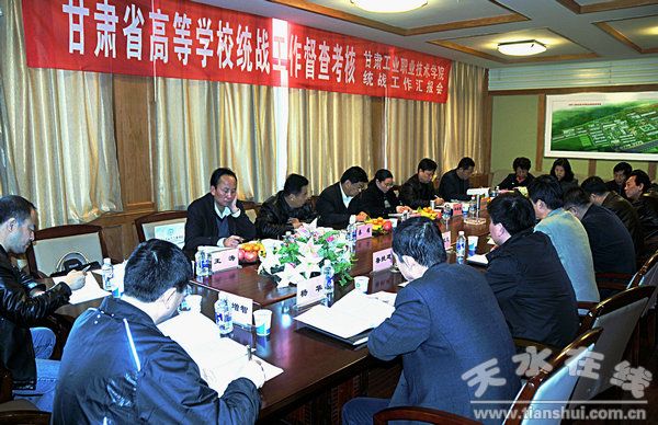 11月29日,以西北民族大學(xué)黨委副書記王扎西為組長、省委統(tǒng)戰(zhàn)部四處處長秦耀和甘肅政法學(xué)院黨委統(tǒng)戰(zhàn)部部長馬虎銀為成員的全省高等學(xué)校統(tǒng)戰(zhàn)工作第三督查考核組在天水市委統(tǒng)戰(zhàn)部部長李美華、副部長邢赟的陪同下,到甘肅工業(yè)職業(yè)技術(shù)學(xué)院督查考核統(tǒng)戰(zhàn)工作。