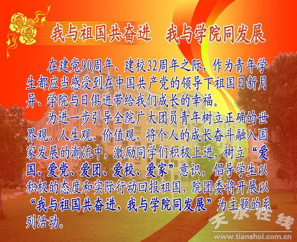 為適應甘肅工業(yè)職業(yè)技術學院青年學生思想實際和成長發(fā)展需求, 深入宣傳黨的十七屆五中全會和2011年全國“兩會”精神,宣傳“十一五”時期經(jīng)濟社會發(fā)展的巨大成就和寶貴經(jīng)驗,宣傳“十二五”時期經(jīng)濟社會發(fā)展的指導思想、總體思路、目標任務和重大舉措,宣傳黨和國家的重要政策,引導學院學生進一步增強學習貫徹黨的十七屆五中全會精神的自覺性和主動性,增強貫徹落實科學發(fā)展觀、加快轉(zhuǎn)變經(jīng)濟發(fā)展方式的責任感和緊迫感,積極投身改革開放和社會主義現(xiàn)代化建設,為實現(xiàn)“十二五”目標充分發(fā)揮生力軍作用,甘肅工職學院黨委宣傳部和院團委按照團中央《關于組織開展“我與祖國共奮進”形勢政策教育活動的通知》,結(jié)合學院形勢與政策課開設要求,正式啟動“我與祖國共奮進 我與學院同發(fā)展”形勢政策系列教育活動。
