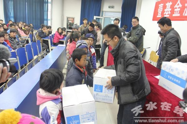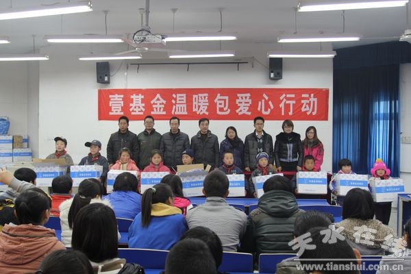 啟動儀式上,來自天水市麥積 區(qū)甘泉中心小學(xué)、謝崖小學(xué),馬跑泉鎮(zhèn)崖灣小學(xué)等學(xué)校的53名孤兒得到了“壹基金溫暖包”。