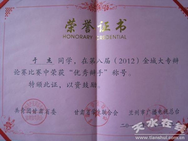 于杰同學(xué)獲得優(yōu)秀辯手稱號(hào)