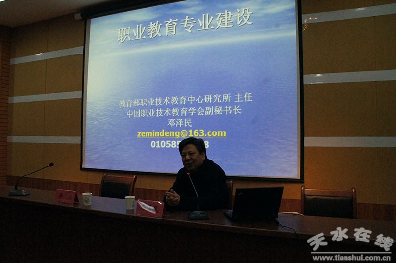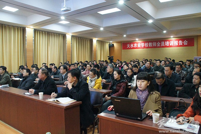 11月23日,天水農校教師全員培訓報告會在學校電化教室舉行。著名職業(yè)教育專家鄧澤民教授作了“職業(yè)教育專業(yè)建設”的學術報告。會議由校長李強主持。學校全體教職員工聆聽了報告。