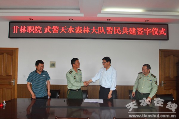 5月20日,甘肅林職學(xué)院與武警隴南市森林支隊(duì)天水大隊(duì)舉行了警民共建協(xié)議簽字儀式,正式結(jié)為警民共建單位,為進(jìn)一步建立和發(fā)展和諧的警民關(guān)系,做到“同呼吸、共命運(yùn)、心連心”,以共建促自建,開展深入合作奠定了基礎(chǔ)。雙方在技術(shù)培訓(xùn)、學(xué)歷提高、文體活動(dòng)、新生軍訓(xùn)、國防教育、精神文明建設(shè)等方面達(dá)成協(xié)議。