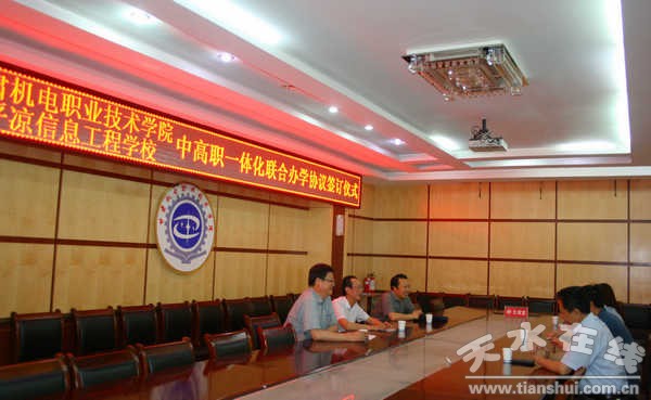 7月10日上午,甘肅機(jī)電職業(yè)技術(shù)學(xué)院與平?jīng)鲂畔⒐こ虒W(xué)校在2樓會(huì)議室舉行“五年一貫制”聯(lián)合辦學(xué)簽約儀式,學(xué)院黨委書記李宗義、院長(zhǎng)張炯、副院長(zhǎng)霍五堂;該校黨委書記賈俊杰、副校長(zhǎng)趙春雷及兩校招生部門負(fù)責(zé)人共同參加。