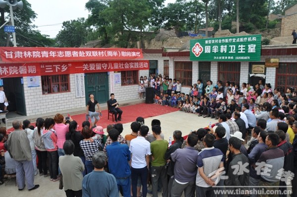 為進一步做好雙聯(lián)幫扶工作,凸顯文化惠農(nóng)、文化幫扶的作用,豐富農(nóng)民群眾文化生活,2015年7月11日,甘肅林職學院青年志愿者在雙聯(lián)點天水市麥積區(qū)石佛鎮(zhèn)周半村與當?shù)匦W聯(lián)合舉辦了慰問演出活動,團委等部門負責同志及雙聯(lián)點群眾500多人觀看了演出。