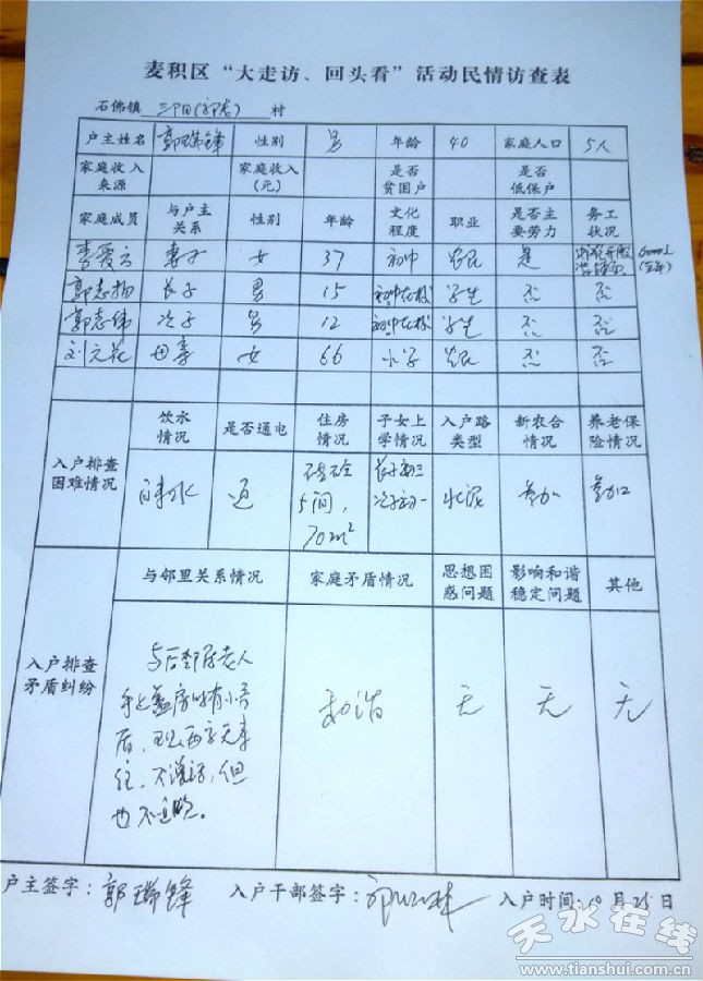 70余名雙聯(lián)干部分成三個工作組,分別走訪了三陽、澗溝、周半三個村,按照“戶戶見干部,一戶也不漏”的要求,每名干部逐一走訪了15戶,每到一戶,都詳細了解農(nóng)戶的生產(chǎn)、生活、住房及收入、子女就業(yè)等情況,就低保政策落實、群眾思想困惑問題、鄰里家庭矛盾糾紛、危舊房屋改善等方面的情況和問題進行了詳細排查和全面分析,認真填寫了麥積區(qū)“大走訪、回頭看”活動民情訪查表,填寫了“民情連心卡”,建立了通暢的連心渠道。