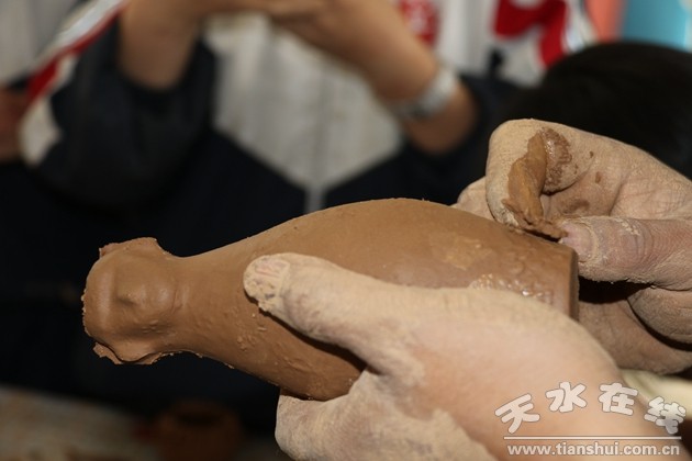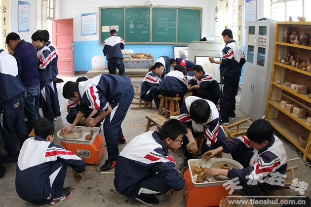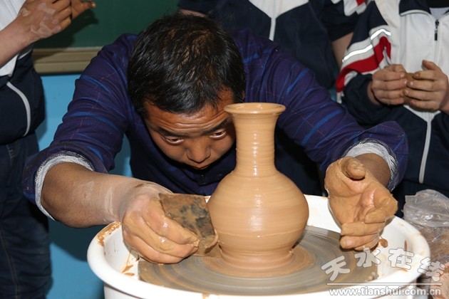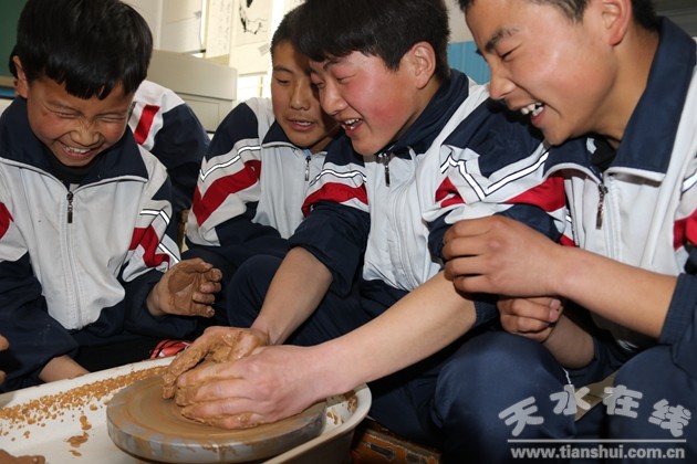 3月31日,秦安縣五營(yíng)初級(jí)中學(xué)的陶藝制作室里,寇彥斌老師先做了簡(jiǎn)單的講解和演示,陶藝興趣班的學(xué)生便手抓紅膠泥當(dāng)起了“泥水匠”,教室里的六臺(tái)拉胚機(jī)轉(zhuǎn)起來(lái)了,每個(gè)學(xué)生全身心投入,學(xué)習(xí)制作人頭形器口彩陶瓶、魚(yú)紋盆和茶壺等藝術(shù)品,一個(gè)半小時(shí)玩得很入,有幾個(gè)學(xué)生完成了自己滿意的作品。