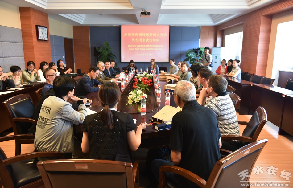5月25至26日,應(yīng)學(xué)校邀請,美國福特海斯州立大學(xué)專家教授代表團一行11人來天水師范學(xué)院進行學(xué)術(shù)交流。26日上午,校長蔡文浩及學(xué)校相關(guān)部門負責(zé)人與代表團進行了親切友好的會面。會談中,蔡文浩首先向與會嘉賓介紹了學(xué)校近年來的發(fā)展現(xiàn)狀以及在國際合作與交流方面取得的成果,并對訪問團來校開展學(xué)術(shù)交流活動表示熱烈的歡迎和衷心的感謝,代表團也對能夠接受學(xué)校邀請開展學(xué)術(shù)交流活動,并以此為契機了解學(xué)校,了解中國當(dāng)?shù)匚幕蜌v史深感榮幸和欣喜。會談過程中,代表團與擔(dān)任下午學(xué)術(shù)報告翻譯工作的外國語學(xué)院教師進行了積極溝通和交流。天水日報、天水晚報和天水廣播電視臺記者對會談進行了采訪,并就學(xué)校國際交流合作工作情況對蔡文浩校長進行了專訪。