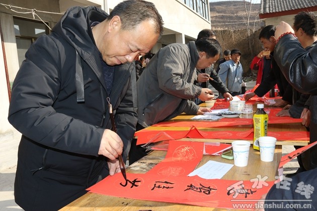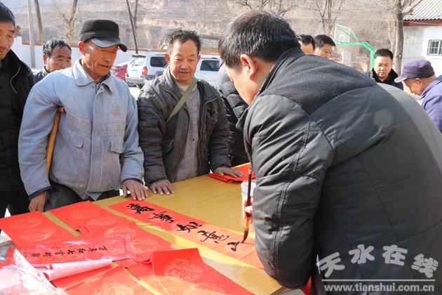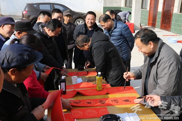 (市教育局黨委副書記郭雙江給村民現(xiàn)場寫春聯(lián))