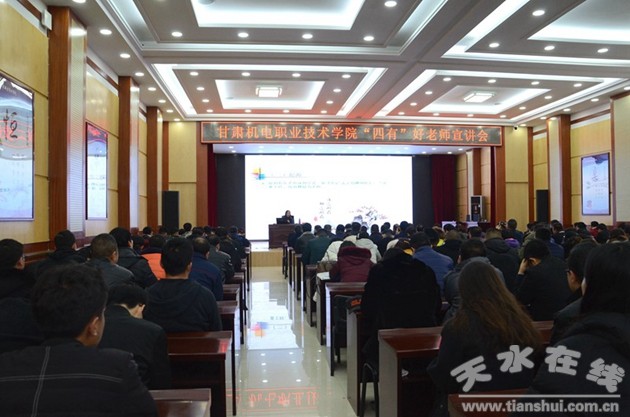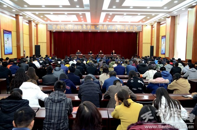 12月3日,由甘肅財(cái)貿(mào)職業(yè)學(xué)院校長(zhǎng)王慶華為組長(zhǎng),蘭州城市學(xué)院副教授趙瑞雪、甘肅能源化工職業(yè)學(xué)院副教授趙長(zhǎng)義為成員的隴原“四有”好老師宣講團(tuán)蒞臨甘肅機(jī)電職業(yè)技術(shù)學(xué)院進(jìn)行宣講。學(xué)院領(lǐng)導(dǎo)趙彥軍、李自勇、毛文輝及師生代表近300人聆聽了宣講。宣講會(huì)由黨委書記、院長(zhǎng)堅(jiān)葆林主持。