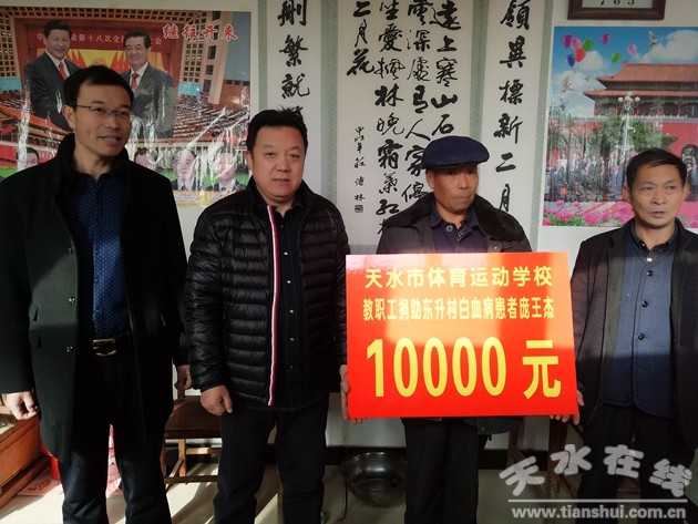 12月6日下午,天水市體校黨總支書記、校長陳玉洪,黨總支副書記薛俱增一行,專程到幫扶村秦安縣葉堡鎮(zhèn)東升村,為該村22歲的白血病患者龐王杰家屬送去學校教職工捐助的10000元愛心善款。