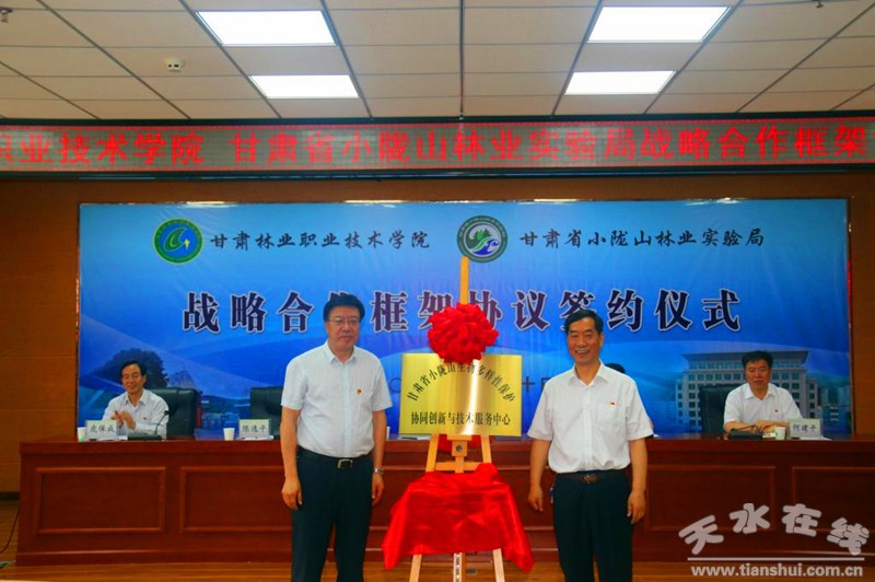 會上,陳逸平、寇明君分別作了致詞;代表校局雙方簽訂了戰(zhàn)略合作框架協(xié)議;共同為甘肅省小隴山生物多樣性保護協(xié)同創(chuàng)新與技術(shù)服務(wù)中心揭牌;代表校局雙方分別向?qū)Ψ绞谟韪拭C省小隴山林業(yè)實驗局“實習(xí)實訓(xùn)基地”和甘肅林業(yè)職業(yè)技術(shù)學(xué)院“人才培養(yǎng)基地”牌匾;⒈3尚x了學(xué)院聘任客座教授文件,陳逸平為寇明君、何建平、馬建偉、鄭應(yīng)選等4名正高級工程師頒發(fā)了客座教授聘書。何建平代表小隴山林業(yè)實驗局向?qū)W院捐贈了1310份甘肅省植物標本,許祖生代表學(xué)院向何建平頒發(fā)了捐贈證書。