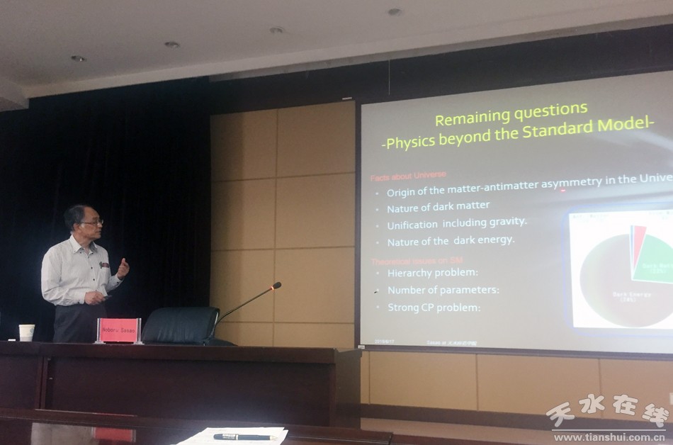 應(yīng)天水師院邀請,6月17日,日本崗山大學(xué)Noboru Sasao教授在學(xué)校辦公樓605會議室作了題為“Particle Physics-from quark to Higgs and beyond”的學(xué)術(shù)報告,蘭州大學(xué)王鐵山教授擔(dān)任翻譯,學(xué)校電子信息與電氣工程學(xué)院物理系全體教師和物理系2018級全體學(xué)生100余人聆聽報告。