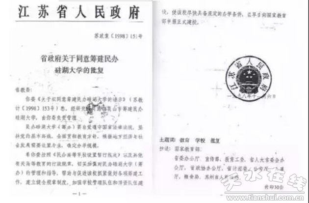 1998年11月13日,江蘇省教育委員會(huì)下發(fā)批復(fù),同意籌建“民辦硅湖大學(xué)”。1998年11月15日,在江蘇省和蘇州市人民政府的大力支持下,硅湖大學(xué)(籌)隆重奠基,成為江蘇創(chuàng)立最早的八所民辦高校之一。僅僅用了十個(gè)月,近十萬(wàn)平方米的新校舍拔地而起。1999年10月4日—10月5日,學(xué)校首屆1250多名新生到校。