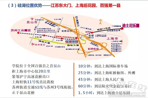 學(xué)院坐落于全國(guó)百?gòu)?qiáng)縣之首昆山,距上海市中心僅20公里,緊鄰滬寧高速花橋出口,上海輕軌11號(hào)線直達(dá)我校,交通十分便捷。蘇州軌道交通S1線已正式開始建設(shè),S1線起點(diǎn)與蘇州3號(hào)線終點(diǎn)站夷亭路站銜接,止于昆山花橋,終點(diǎn)與上海11號(hào)線花橋站連接,在不久的將來(lái),大家可以更加便捷的往來(lái)于蘇州、上海和花橋之間。