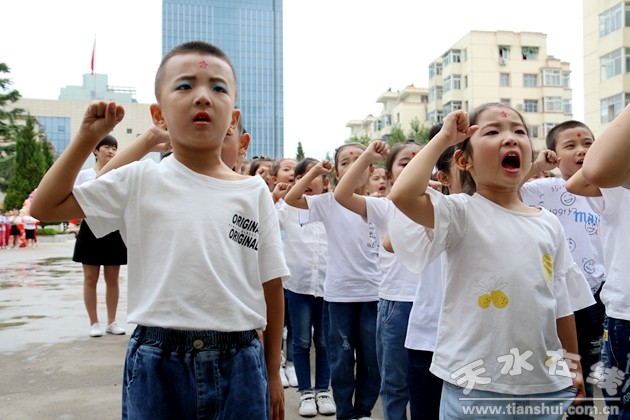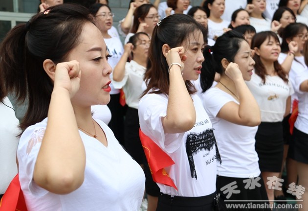 該校的慶祝活動(dòng)突出“慶祝新中國七十華誕,弘揚(yáng)新時(shí)代尊師風(fēng)尚”這一主題,舉行了一年級(jí)新生入學(xué)暨教師宣誓儀式,孩子們稚嫩的童聲背誦《三字經(jīng)》,全體教師在國旗下宣誓,之后合唱《不忘初心》《我和我的祖國》。