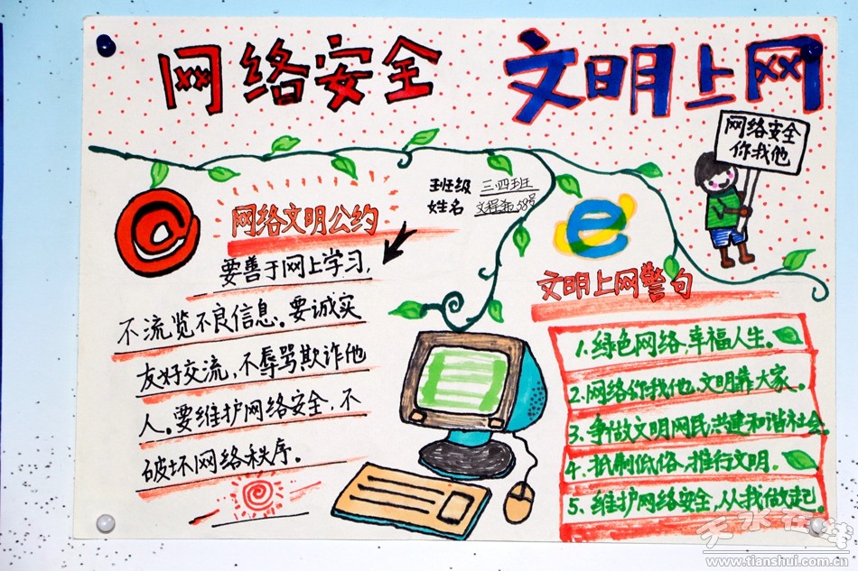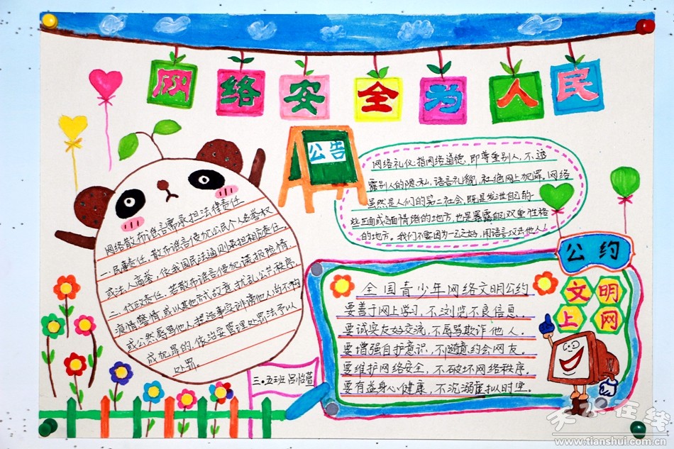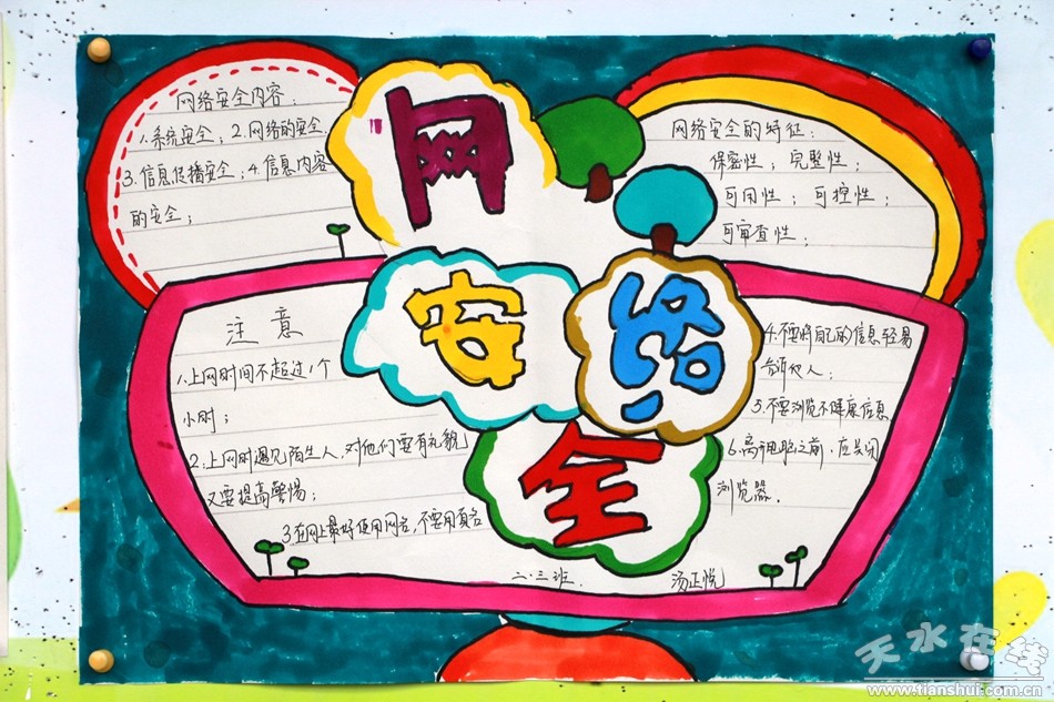 校園內(nèi)宣掛宣傳標(biāo)語,各個(gè)班級(jí)舉辦《共建網(wǎng)絡(luò)安全,共享網(wǎng)絡(luò)文明》主題班會(huì),普及網(wǎng)絡(luò)安全知識(shí),發(fā)動(dòng)學(xué)生制作手抄報(bào)。通過本次活動(dòng),廣大師生樹立了正確的上網(wǎng)意識(shí),讓網(wǎng)絡(luò)安全知識(shí)深入廣大師生心中,校園內(nèi)形成了良好的網(wǎng)絡(luò)安全氛圍。