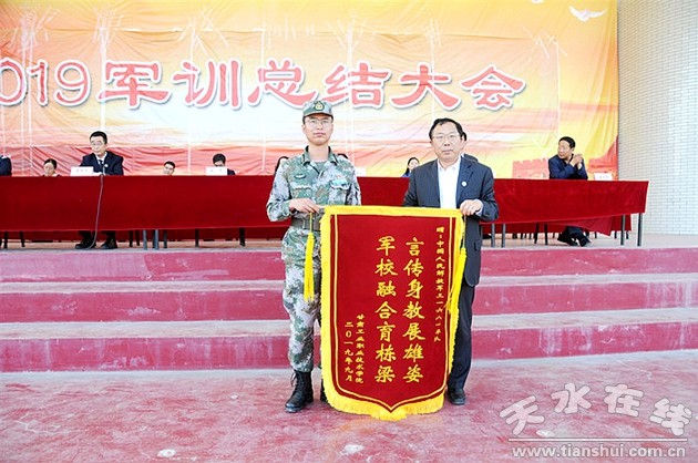 2019級全體同學(xué)接受了學(xué)校領(lǐng)導(dǎo)和教官的檢閱。參訓(xùn)新生進(jìn)行了分列式和匯報(bào)表演,各方隊(duì)整齊劃一、口號響亮、軍姿嚴(yán)整,以嶄新的精神面貌向?qū)W校領(lǐng)導(dǎo)、老師和教官匯報(bào)軍訓(xùn)的豐碩成果。楊聲書記代表學(xué)校向支持和指導(dǎo)該校軍訓(xùn)工作的部隊(duì)贈送了錦旗。部隊(duì)首長和學(xué)校領(lǐng)導(dǎo)為優(yōu)秀學(xué)員頒發(fā)了榮譽(yù)證書。