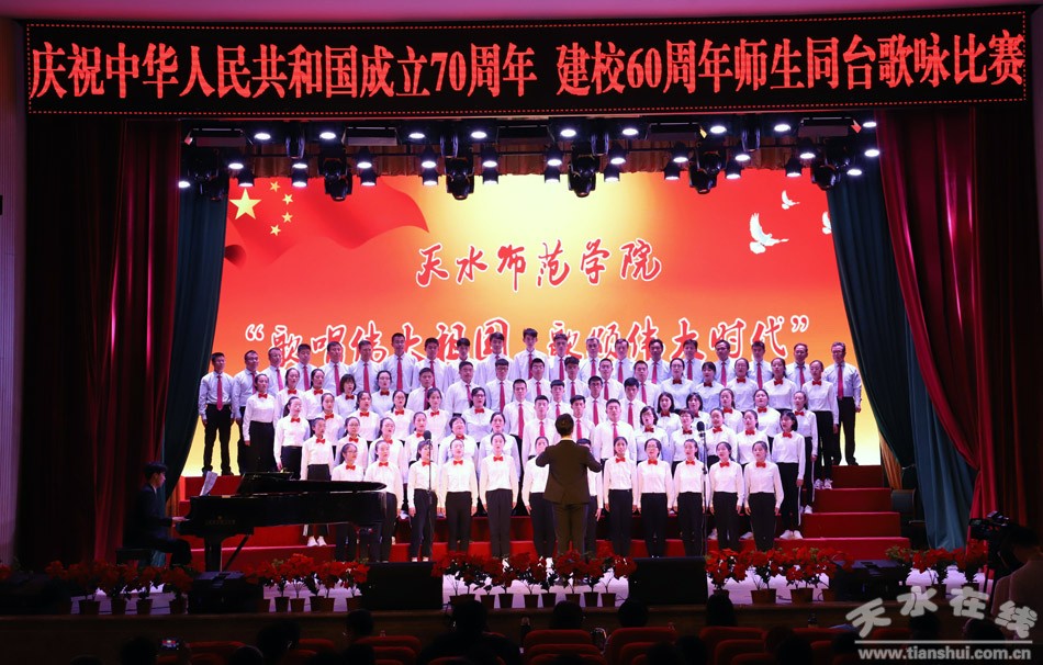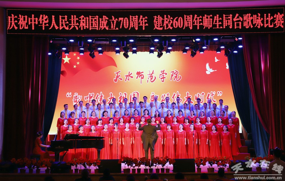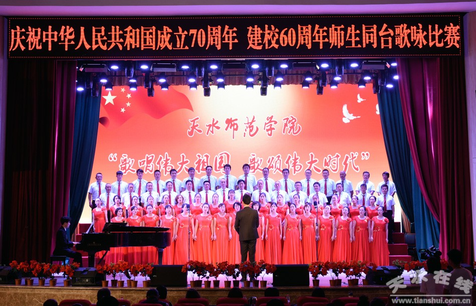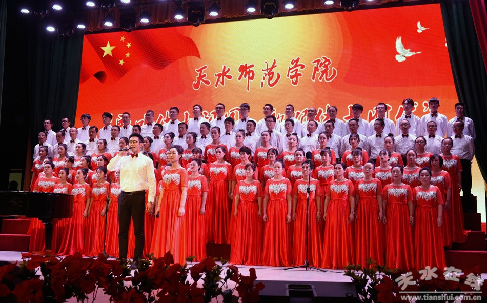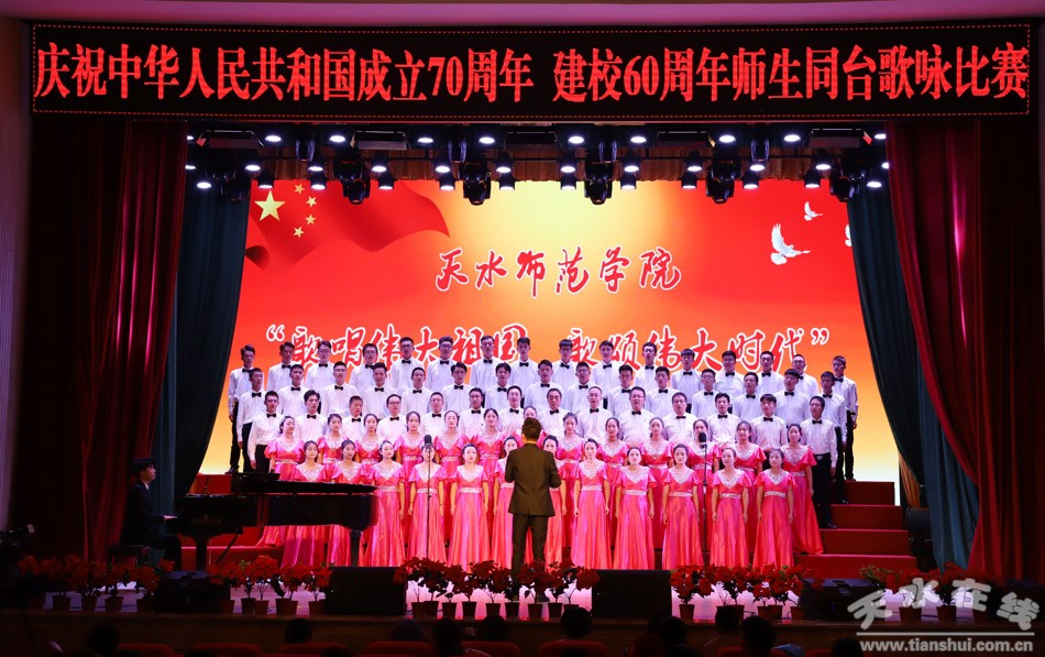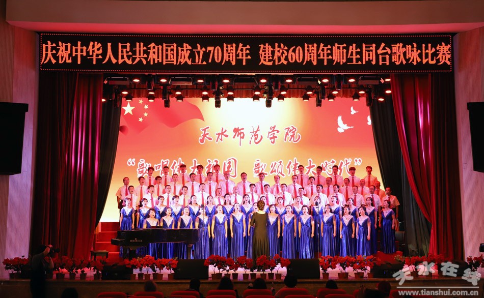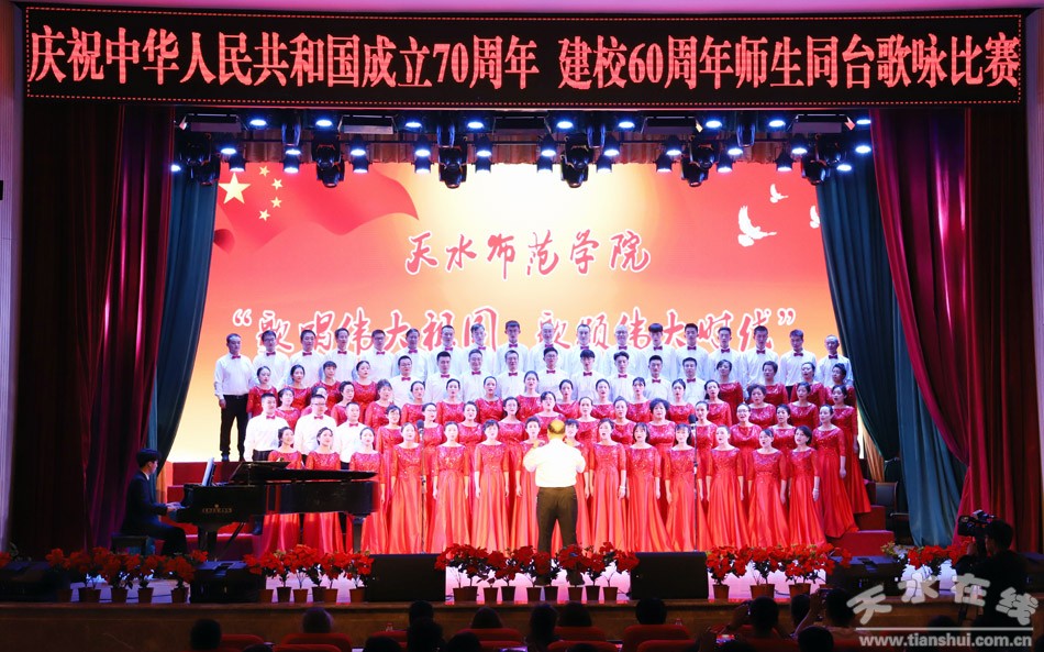 盛世一曲獻祖國,高歌奮進新時代。9月26日,天水師范學院舉行“歌唱偉大祖國、歌頌偉大時代”慶祝中華人民共和國成立70周年、建校60周年師生同臺合唱比賽。這是學校首次以師生同臺的形式唱響愛國情,來自全校各單位、各部門的師生用最嘹亮的歌聲,追憶中華民族從站起來到富起來、強起來的歷史性飛躍,共同獻禮中華人民共和國成立70周年。在校校領導和黨委常委出席活動并與師生同唱奮進之歌。