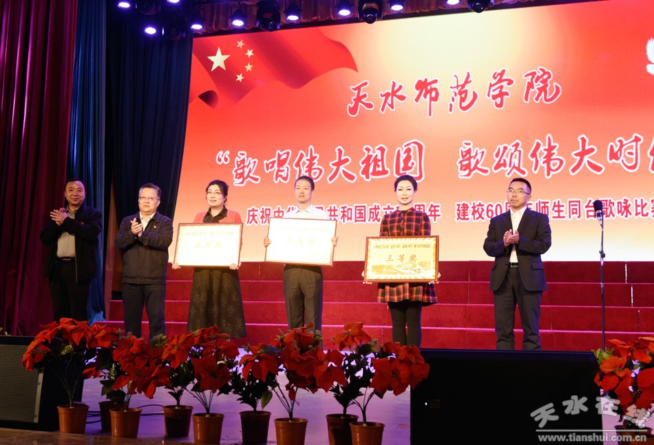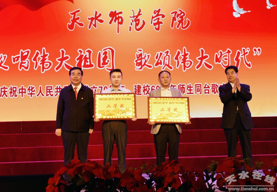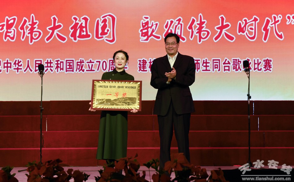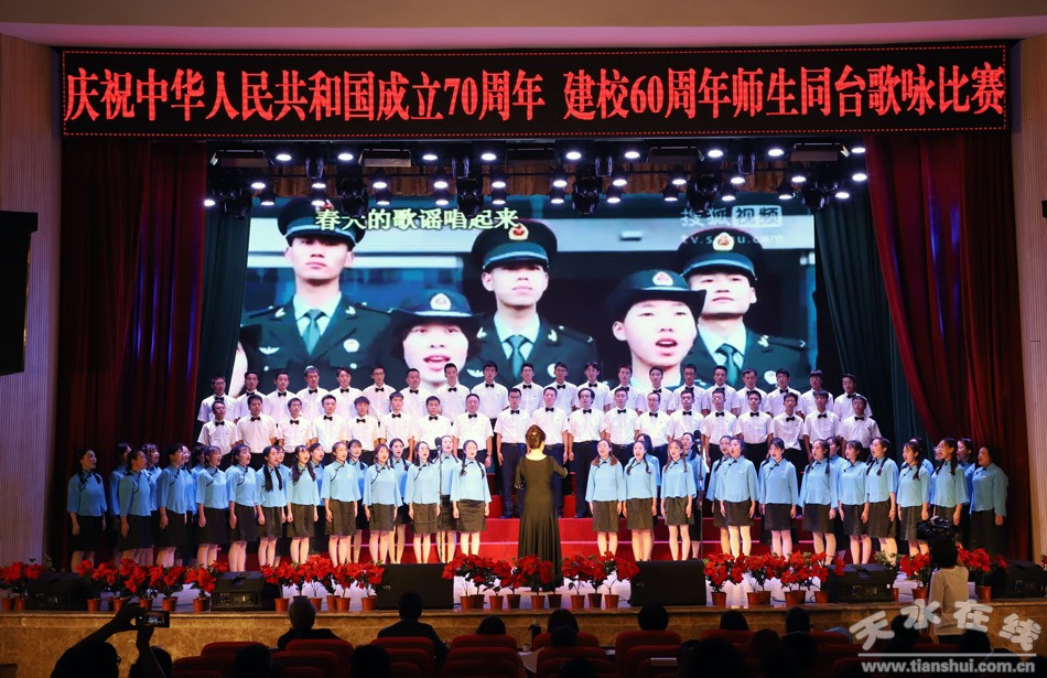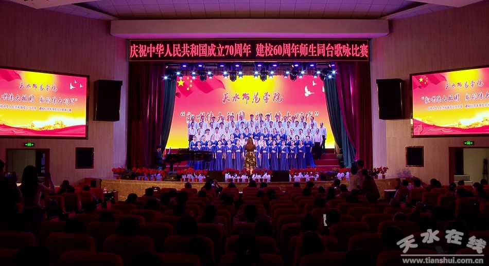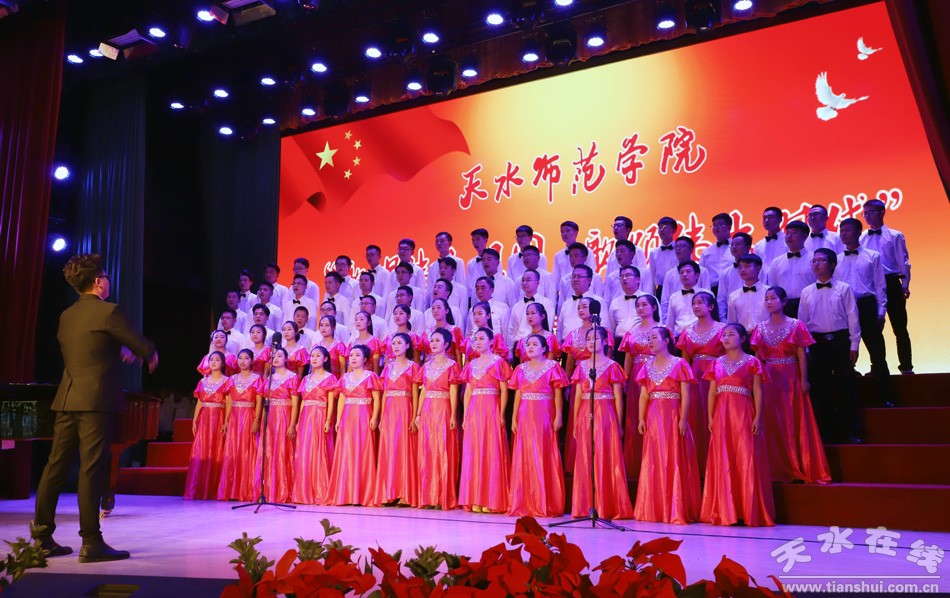 盛世一曲獻祖國,高歌奮進新時代。9月26日,天水師范學院舉行“歌唱偉大祖國、歌頌偉大時代”慶祝中華人民共和國成立70周年、建校60周年師生同臺合唱比賽。這是學校首次以師生同臺的形式唱響愛國情,來自全校各單位、各部門的師生用最嘹亮的歌聲,追憶中華民族從站起來到富起來、強起來的歷史性飛躍,共同獻禮中華人民共和國成立70周年。在校校領導和黨委常委出席活動并與師生同唱奮進之歌。