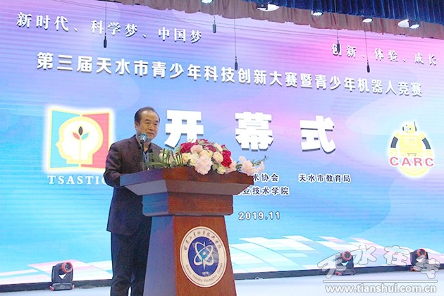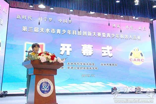 校黨委書記楊聲致辭,他代表學(xué)校向?qū)3躺W臨我校指導(dǎo)工作的天水市委、市政府、人大、政協(xié)的各位領(lǐng)導(dǎo)及參賽選手和教師表示熱烈歡迎,向多年來一直支持學(xué)校發(fā)展的天水市科學(xué)技術(shù)協(xié)會、市教育局的各位領(lǐng)導(dǎo)表示衷心感謝。楊聲指出,甘肅工業(yè)職業(yè)技術(shù)學(xué)院作為一所植根天水的地方高校,終以科技創(chuàng)新工作為己任。近年來,學(xué)校緊密對接國家創(chuàng)新驅(qū)動發(fā)展戰(zhàn)略,立足產(chǎn)教研深度融合和創(chuàng)新創(chuàng)業(yè)教育,以甘肅省優(yōu)質(zhì)高職院校建設(shè)為契機(jī),不斷優(yōu)化專業(yè)設(shè)置、創(chuàng)新人才培養(yǎng)方案、出臺科研創(chuàng)新制度,全面實施了學(xué)校專業(yè)建設(shè)和科研創(chuàng)新2.0版提升工程,學(xué)校教育教學(xué)和科研創(chuàng)新能力明顯提高。在做好自身教育教學(xué)和科技創(chuàng)新工作的同時,也非常注重為地方經(jīng)濟(jì)社會發(fā)展服務(wù)。學(xué)校已經(jīng)連續(xù)成功舉辦兩屆全市青少年科技創(chuàng)新大賽,成為展示我市青少年科技創(chuàng)新成果、培養(yǎng)科技創(chuàng)新人才的重要賽事。作為本次全市青少年科技創(chuàng)新大賽的承辦單位,學(xué)校將盡心竭力,為大賽做好各項服務(wù)保障工作,努力把本屆大賽辦成一次富有成果、精彩圓滿的大賽。