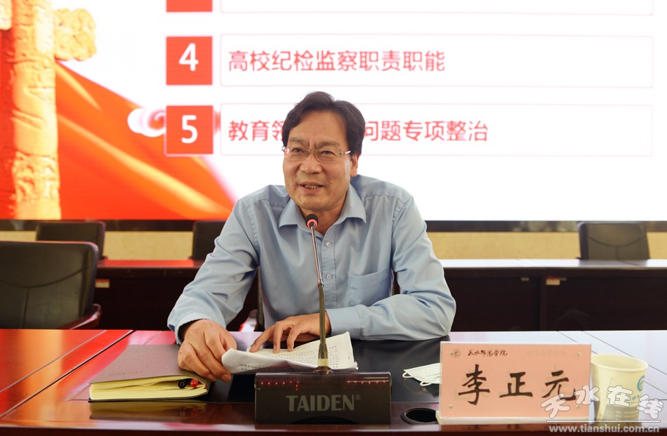 應(yīng)天水師范學(xué)院邀請(qǐng),6月5上午,省紀(jì)委監(jiān)委第八監(jiān)督檢查室主任陳中偉為該校領(lǐng)導(dǎo)干部作《強(qiáng)化交流互動(dòng) 推動(dòng)紀(jì)檢監(jiān)察工作高質(zhì)量發(fā)展》專題輔導(dǎo)報(bào)告,此次報(bào)告會(huì)是該!包h風(fēng)廉政教育月”活動(dòng)的首場(chǎng)專題報(bào)告,黨委書記李正元主持報(bào)告會(huì)并講話。