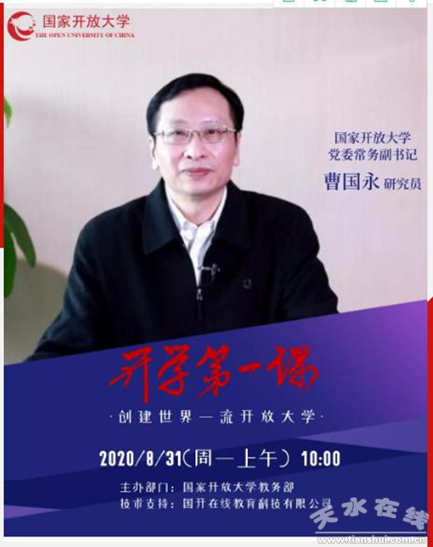 8月31日上午,在秋季學(xué)期開學(xué)伊始,甘肅電大天水分校組織專業(yè)管理員和全體開放教育學(xué)員收看了國家開放大學(xué)黨委常務(wù)副書記曹國永以視頻直播方式主講的“開學(xué)第一課——創(chuàng)建世界一流開放大學(xué)”。
