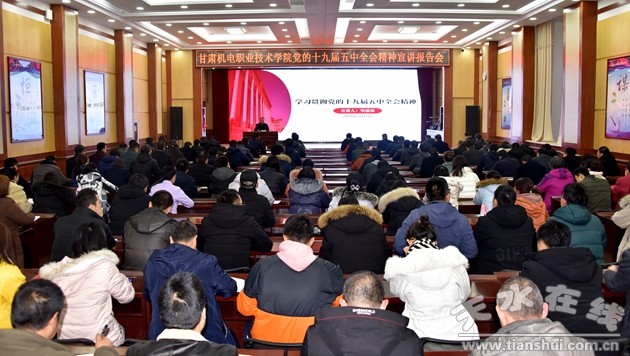 12月1日下午,甘肅機(jī)電職業(yè)技術(shù)學(xué)院學(xué)院召開黨的十九屆五中全會(huì)精神宣講報(bào)告會(huì)。黨委書記、院長(zhǎng)堅(jiān)葆林作宣講報(bào)告。在家院領(lǐng)導(dǎo)趙彥軍、李自勇、張德龍出席報(bào)告會(huì),副處級(jí)干部、全體中層干部(含助理)、全體黨員及教研室主任共計(jì)150余人參加報(bào)告會(huì)。