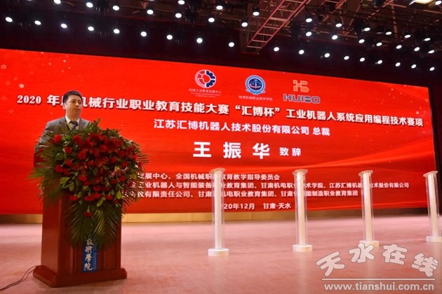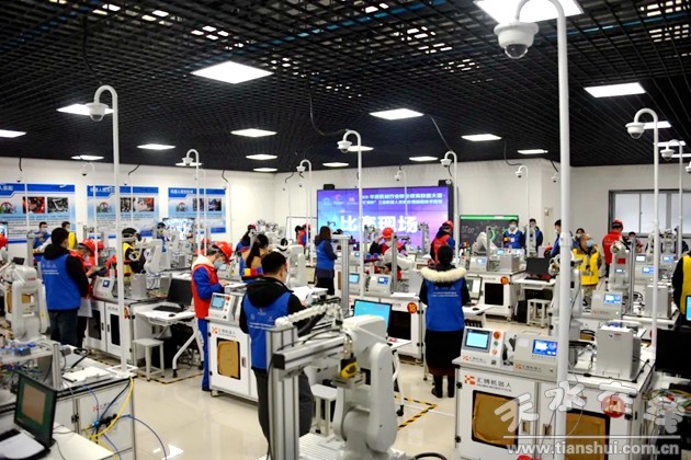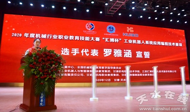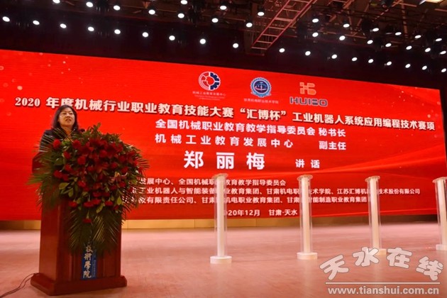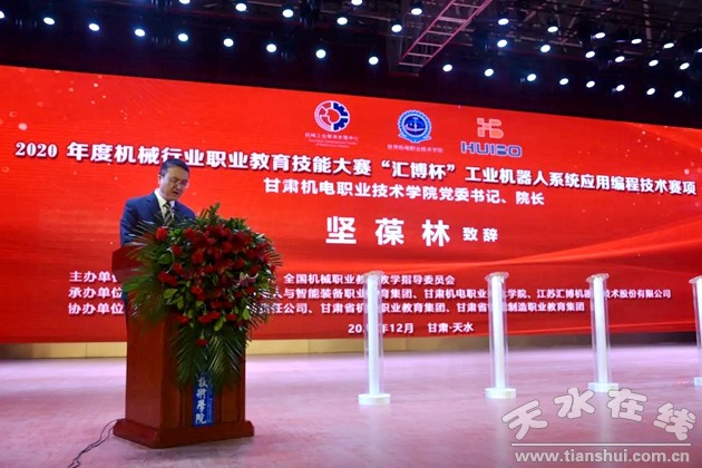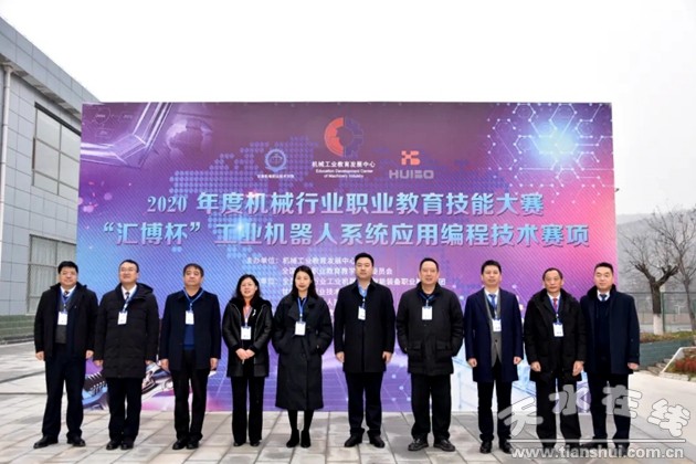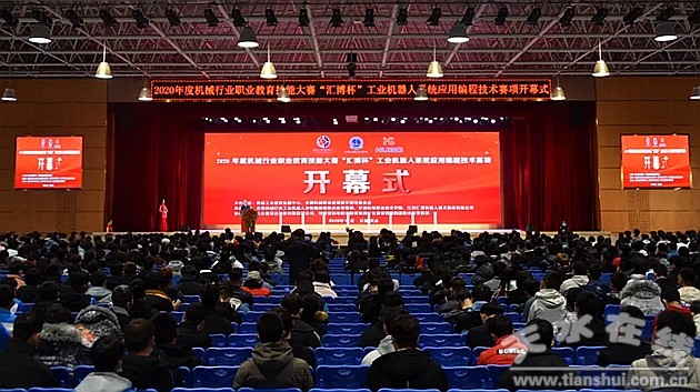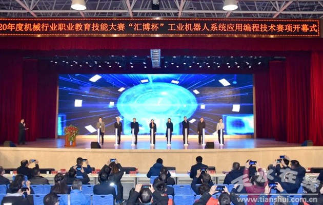 12月6日上午,2020年度機(jī)械行業(yè)職業(yè)教育技能大賽“匯博杯”工業(yè)機(jī)器人系統(tǒng)應(yīng)用編程技術(shù)賽項(xiàng)在學(xué)院開(kāi)幕。教育部職成司院校發(fā)展處副處長(zhǎng)王珊珊,甘肅省教育廳職成處副處長(zhǎng)令軍輝,全國(guó)機(jī)械職業(yè)教育教學(xué)指導(dǎo)委員會(huì)秘書(shū)長(zhǎng)、機(jī)械工業(yè)教育發(fā)展中心副主任鄭麗梅,天水市教育局副局長(zhǎng)楊?lèi)?ài)民,賽項(xiàng)總專(zhuān)家組長(zhǎng)、蘭州交通大學(xué)原副校長(zhǎng)李宗義,江蘇匯博機(jī)器人技術(shù)股份有限公司總裁王振華,高職組賽項(xiàng)裁判長(zhǎng)、深圳職業(yè)技術(shù)學(xué)院機(jī)電學(xué)院系主任王文斌,學(xué)院領(lǐng)導(dǎo)堅(jiān)葆林、趙彥軍、李自勇、張德龍、毛文輝出席開(kāi)幕式。與會(huì)嘉賓、裁判員和參賽選手代表、各參賽院校領(lǐng)隊(duì)、技術(shù)指導(dǎo)及學(xué)院師生近1500人參加開(kāi)幕式。