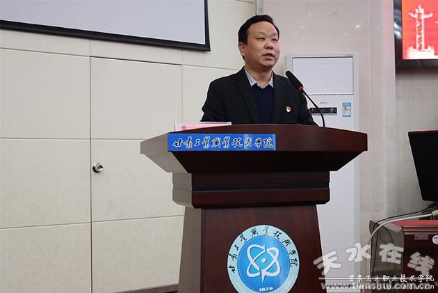 12月10日下午,省政協(xié)教科衛(wèi)體委員會(huì)副主任馮湖在甘肅工業(yè)職業(yè)技術(shù)學(xué)院圖書(shū)館智敏學(xué)術(shù)報(bào)告廳為廣大師生作題為《邁向新征程 奮斗新目標(biāo) 全面建設(shè)社會(huì)主義現(xiàn)代化國(guó)家》的專題輔導(dǎo)報(bào)告。學(xué)校黨委書(shū)記楊聲、全體黨員、馬克思主義學(xué)院專兼職教師、全體輔導(dǎo)員、“1231”工程全體學(xué)生成員、國(guó)旗護(hù)衛(wèi)隊(duì)隊(duì)員及團(tuán)學(xué)干部代表聆聽(tīng)了報(bào)告。報(bào)告會(huì)由紀(jì)委書(shū)記、監(jiān)察專員潘文生主持。