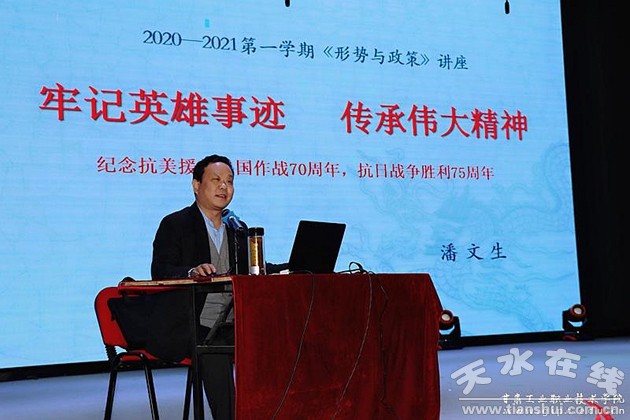 12月1日至10日晚,甘肅工業(yè)職業(yè)技術(shù)學(xué)院紀(jì)委書記、監(jiān)察專員潘文生在大學(xué)生活動中心先后5次以“牢記英雄事跡 傳承偉大精神——紀(jì)念抗美援朝出國作戰(zhàn)70周年、抗日戰(zhàn)爭勝利75周年”為主題,給2020級3500余名新生作了生動的愛國主義專題講座。