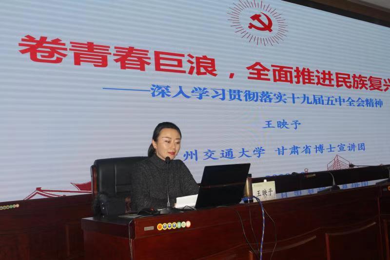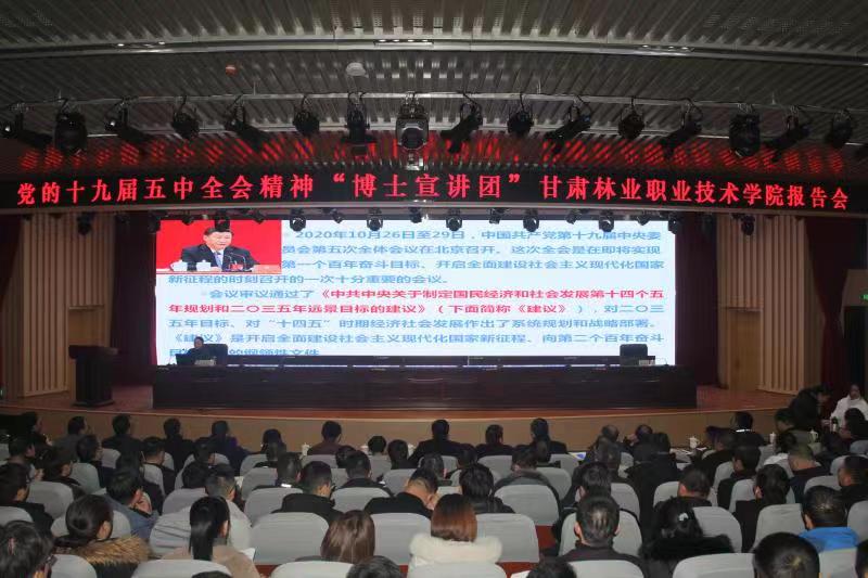 12月18日,由甘肅省委教育工委、甘肅省委講師團組織的“博士宣講團”走進甘肅林業(yè)職業(yè)技術(shù)學院,專題宣講黨的十九屆五中全會精神。宣講團員成員、蘭州交通大學王映予博士以《卷青春巨浪,全面推進民族復興——深入學習貫徹黨的十九屆五中全會精神》為題,圍繞“《建議》出臺的背景、十八大以來取得的決定性成就、我國發(fā)展環(huán)境面臨的復雜變化、‘十四五’和‘2035遠景目標’、‘我們怎么看,我們怎么辦’”等5個方面作了宣講。