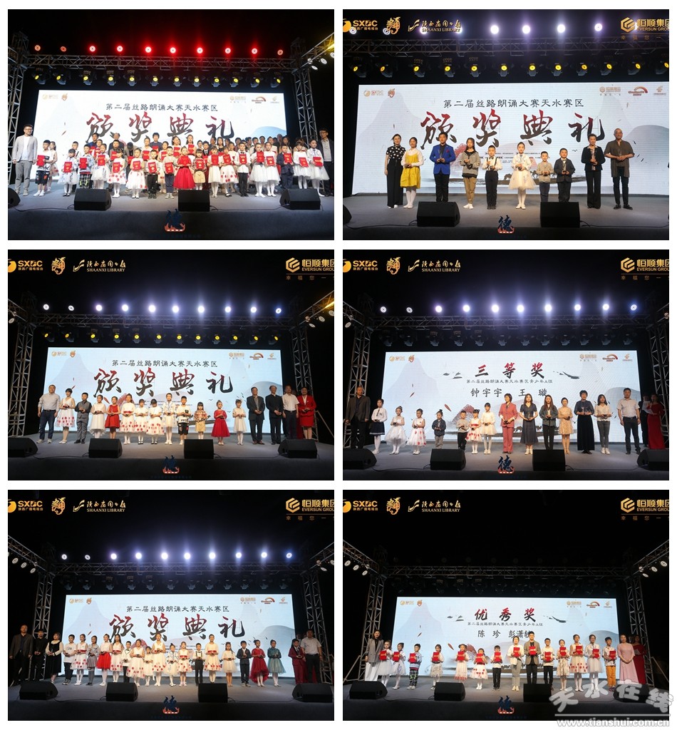“第二屆絲路朗誦大賽”,自去年九月份啟動(dòng)以來,在歷時(shí)三個(gè)月的賽事中,吸引了包括秦州、麥積、清水、秦安、張家川等五縣兩區(qū),以及隴南成縣、西和等縣區(qū)的上千名朗誦愛好者參與和數(shù)十萬受眾的關(guān)注。經(jīng)過初賽、復(fù)賽、決賽,最終產(chǎn)生一等獎(jiǎng)名,二等獎(jiǎng)名,三等獎(jiǎng)名,優(yōu)秀獎(jiǎng),頒獎(jiǎng)晚會(huì)上為在第二屆絲路朗誦大賽中榮獲“一等獎(jiǎng)、二等獎(jiǎng)、三等獎(jiǎng)、優(yōu)秀指導(dǎo)教師獎(jiǎng)、優(yōu)秀組織獎(jiǎng)、優(yōu)秀志愿者”的選手、輔導(dǎo)教師、藝術(shù)機(jī)構(gòu)頒獎(jiǎng)。