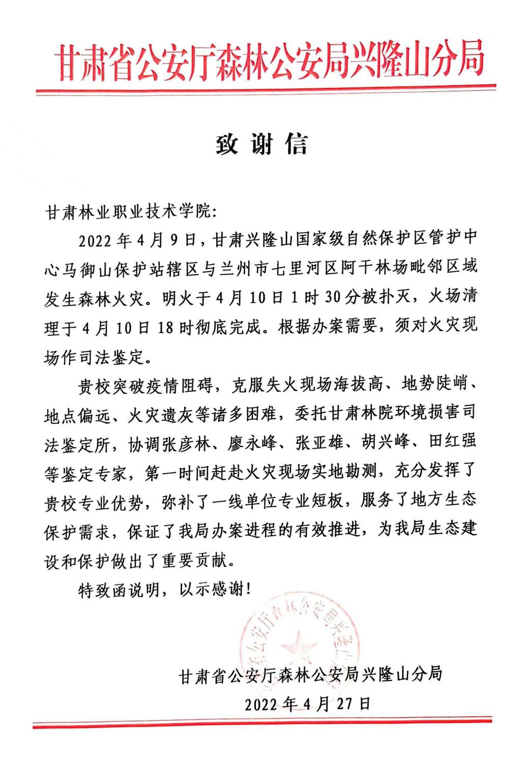 日前,甘肅省公安廳森林公安局興隆山分局向甘肅林業(yè)職業(yè)技術(shù)學(xué)院發(fā)來(lái)致謝信,對(duì)該校林業(yè)司法鑒定所大力支持興隆山自然保護(hù)區(qū)森林火災(zāi)鑒定工作取得關(guān)鍵性進(jìn)展致以誠(chéng)摯謝意。